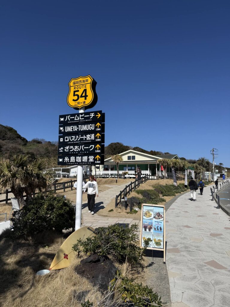 糸島半島の海沿いを走る「福岡県道54号線」は、福岡を代表する海岸線ドライブコースのひとつだ。2026年3月、西区の今津干潟を起点に、今津運動公園前・大原海岸・ざうお本店前・宮の浦・西の浦・西浦浜を経て名勝・二見ヶ浦に至る、およそ10kmに渡る車道沿いに、合計8本のオシャレな看板が設置された。
